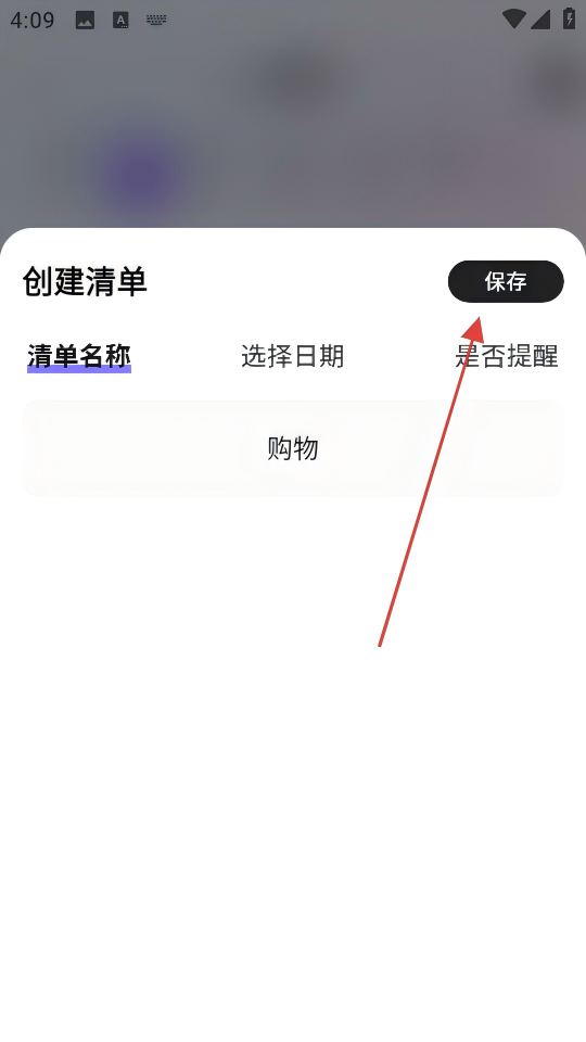 3、填寫清單名稱(如購物),設(shè)置日期及提醒,點擊【保存】完成創(chuàng)建。