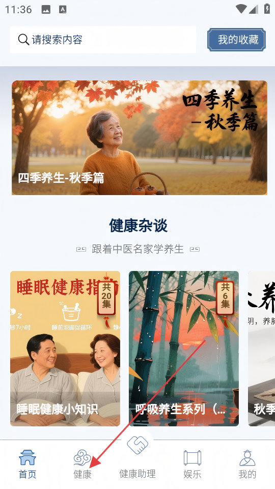 2、首頁底部點(diǎn)擊【健康】進(jìn)入健康頁面,瀏覽養(yǎng)生相關(guān)內(nèi)容。