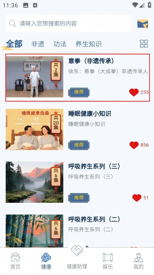 3、健康頁找到【意拳(非遺傳承)】視頻,點(diǎn)擊進(jìn)入詳情頁,查看課程信息。