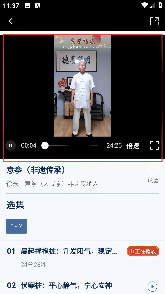 4、進(jìn)入意拳視頻詳情頁,點(diǎn)擊播放學(xué)習(xí)【晨起撐抱樁】等非遺養(yǎng)生內(nèi)容。