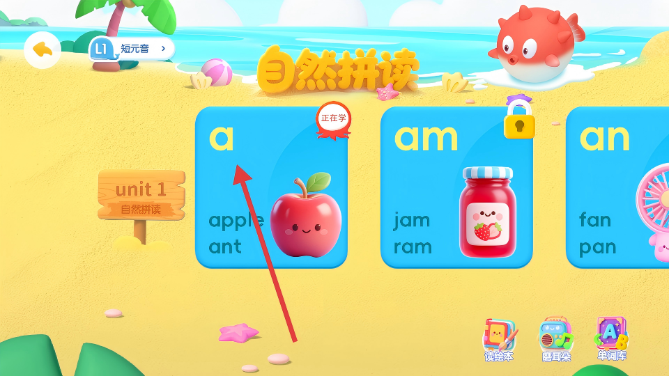 2、在自然拼讀頁面點擊標(biāo)有【a】的學(xué)習(xí)卡片開始學(xué)習(xí)。