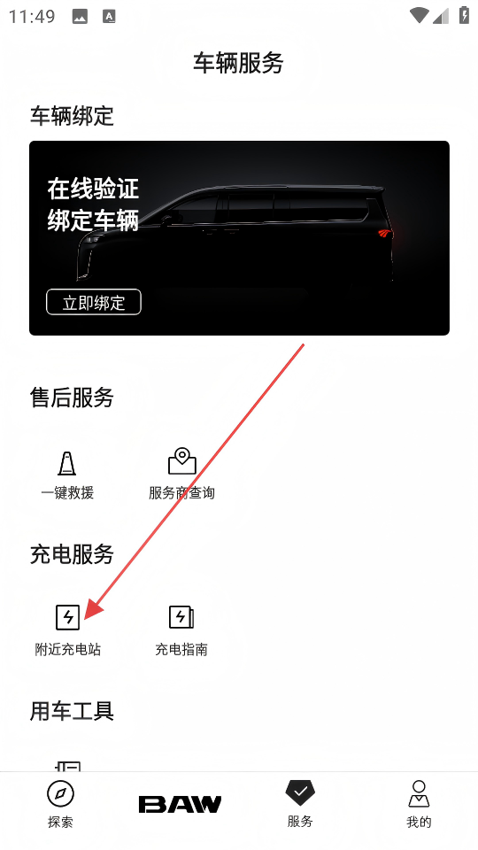 2、車輛服務(wù)頁找到【充電服務(wù)】,點擊【附近充電站】,獲取周邊充電點信息。