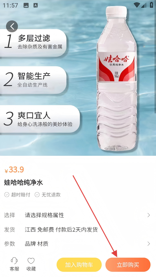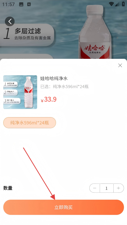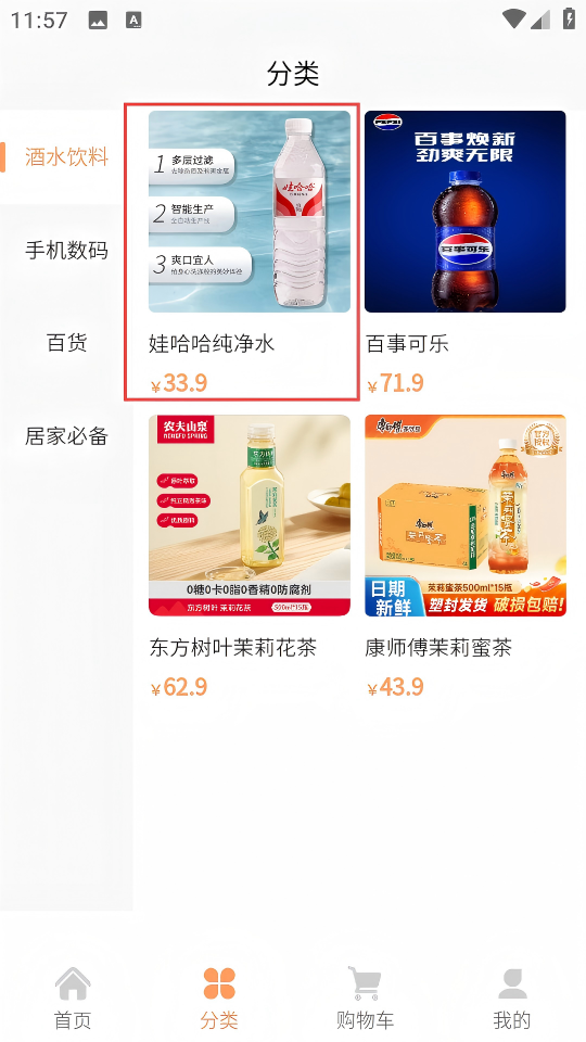2、分類(lèi)頁(yè)酒水飲料區(qū)選【娃哈哈純凈水】,進(jìn)入該商品詳情頁(yè)查看產(chǎn)品信息。