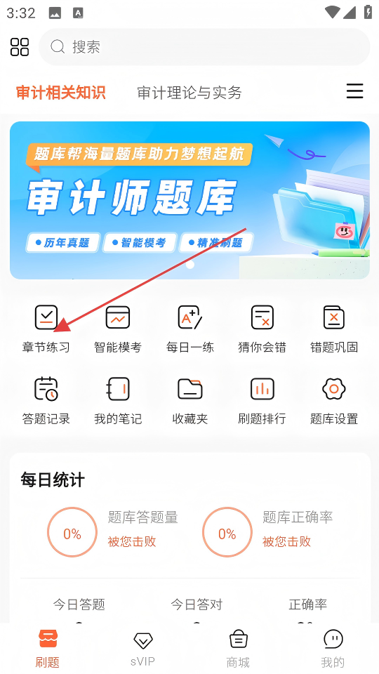 1、在審計(jì)師題庫(kù)首頁(yè),點(diǎn)擊【章節(jié)練習(xí)】功能入口,進(jìn)入章節(jié)列表頁(yè)。