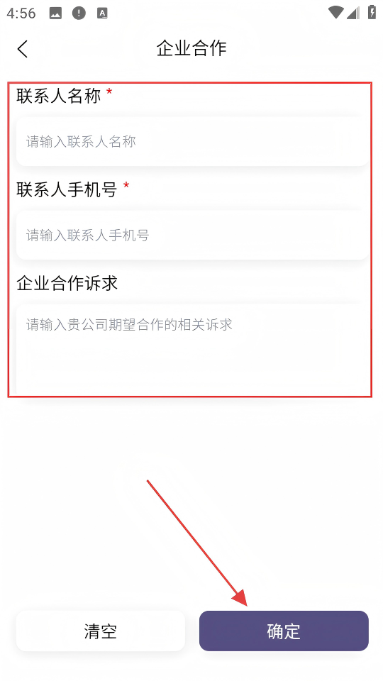 4、填寫聯(lián)系人名稱、手機(jī)號(hào)、合作訴求,點(diǎn)擊【確定】提交合作申請(qǐng)。