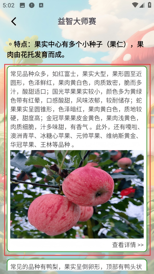 4、瀏覽水果品種介紹(如紅富士、國(guó)光蘋果等信息),查看詳情。