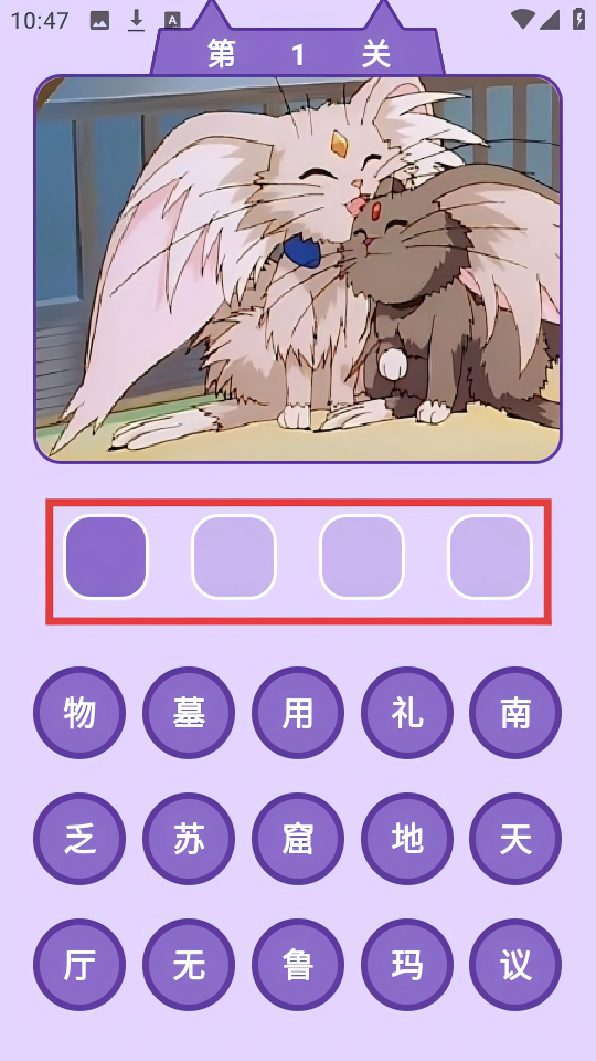 4、觀察第1關(guān)的動(dòng)漫圖片,從下方文字中選取正確漢字,填入四個(gè)空格完成答題。