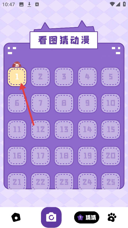 3、點(diǎn)擊下方【猜猜】頁,點(diǎn)擊標(biāo)有【1】的關(guān)卡,進(jìn)入第1關(guān)答題界面。