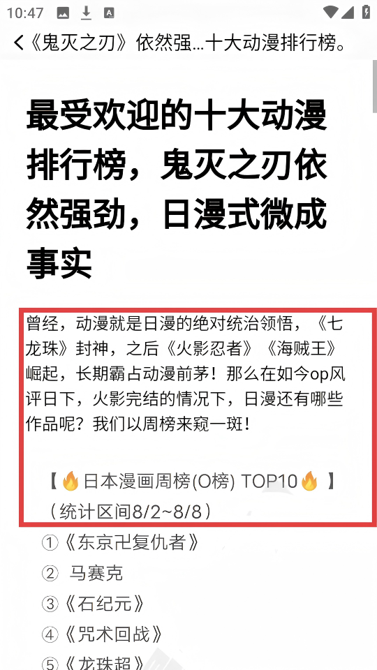 2、查看文章內(nèi)容,了解【日本漫畫周榜TOP10】的相關(guān)信息。