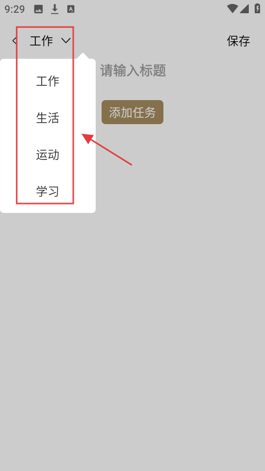 3、點(diǎn)擊分類(lèi)下拉框,會(huì)出現(xiàn)【工作】【生活】【運(yùn)動(dòng)】【學(xué)習(xí)】等分類(lèi)選項(xiàng),可挑選合適分類(lèi)喲。