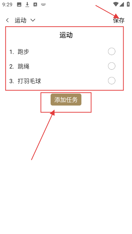4、選好分類(lèi),比如【運(yùn)動(dòng)】,可看到已有跑步、跳繩等任務(wù),點(diǎn)擊【添加任務(wù)】能新增,最后點(diǎn)【保存】就行啦。