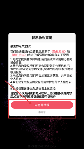 1、使用軟件前,需閱讀【隱私協(xié)議聲明】,點(diǎn)擊【同意并繼續(xù)】按鈕,即可進(jìn)入軟件功能界面。