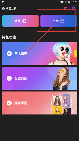 2、進(jìn)入軟件后,在圖片處理區(qū)域點(diǎn)擊【拼圖】按鈕,可進(jìn)入照片選擇頁(yè)面。
