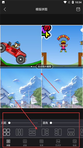 4、進(jìn)入模板拼圖界面后,可調(diào)整間距、圓角等,還能雙擊圖片編輯,完成后即可生成拼圖。