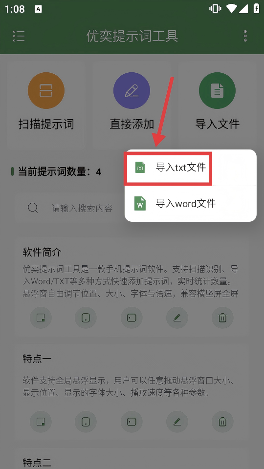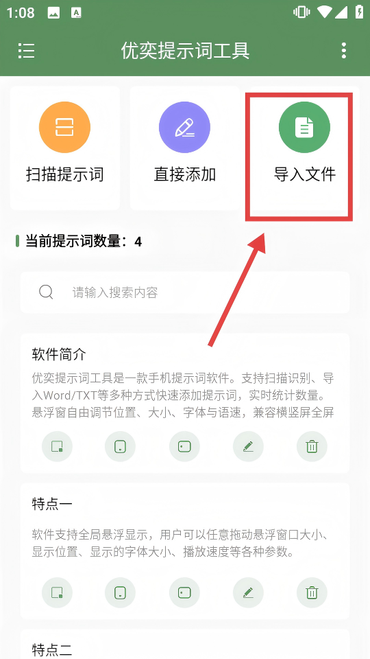 1、打開“優(yōu)奕提示詞工具”APP,點(diǎn)擊【導(dǎo)入文件】,彈出文件導(dǎo)入選項(xiàng)。