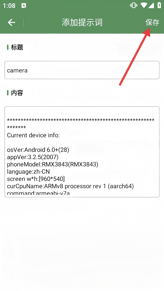 4、確認(rèn)標(biāo)題、內(nèi)容后,點(diǎn)擊右上角【保存】,完成提示詞添加。