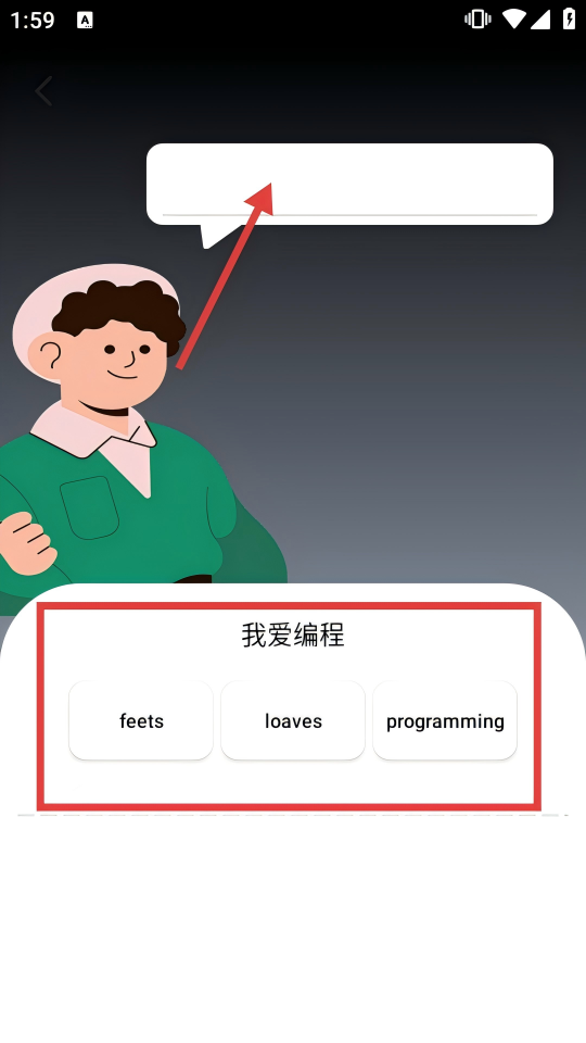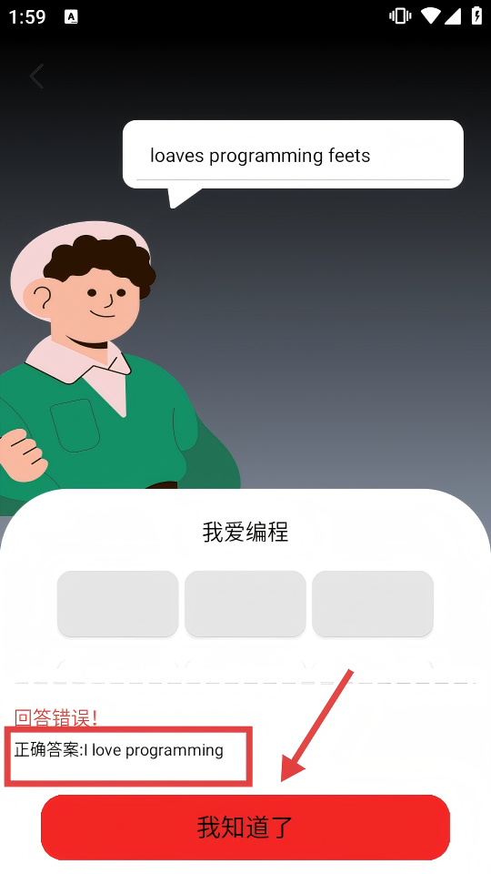 3、遇到“我愛(ài)編程”翻譯題時(shí),從選項(xiàng)里選合適單詞,填入上方輸入框。