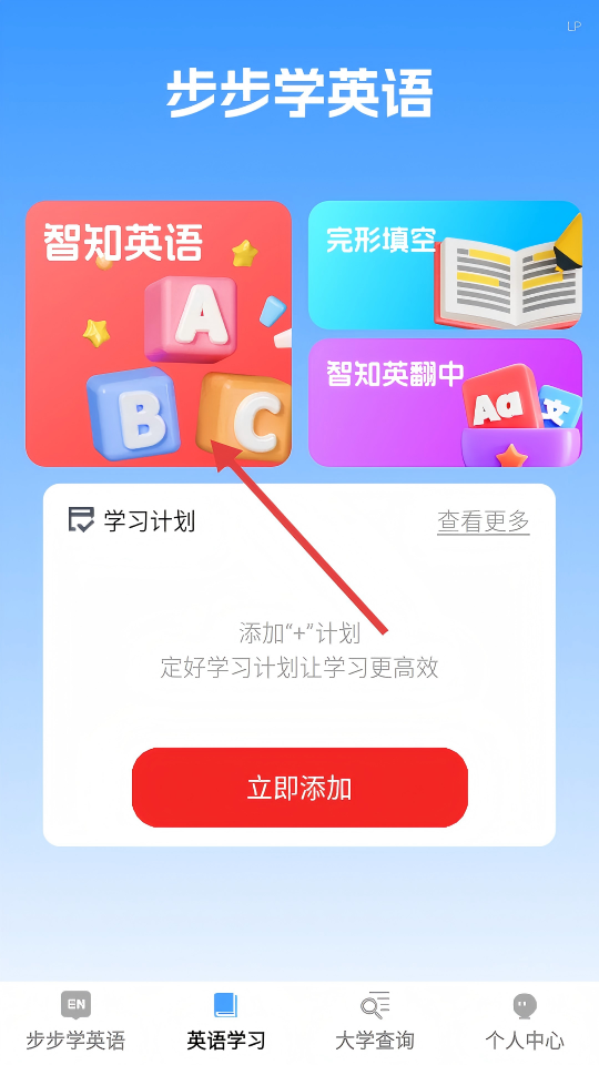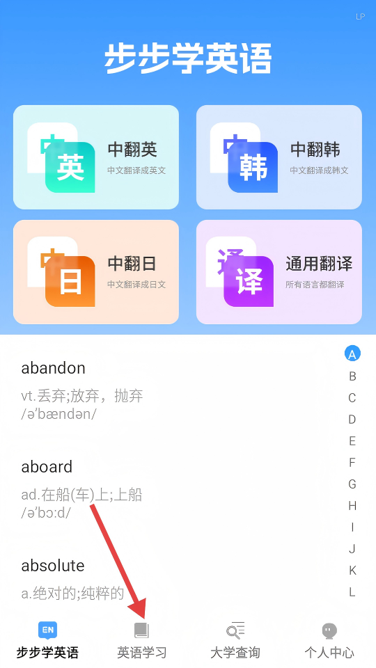 1、打開(kāi)“步步學(xué)英語(yǔ)”APP,點(diǎn)擊底部【英語(yǔ)學(xué)習(xí)】,進(jìn)入英語(yǔ)學(xué)習(xí)頁(yè)面。