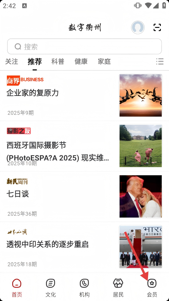1、打開“數(shù)字衢州”APP,點擊底部【會員】,進入會員頁面。