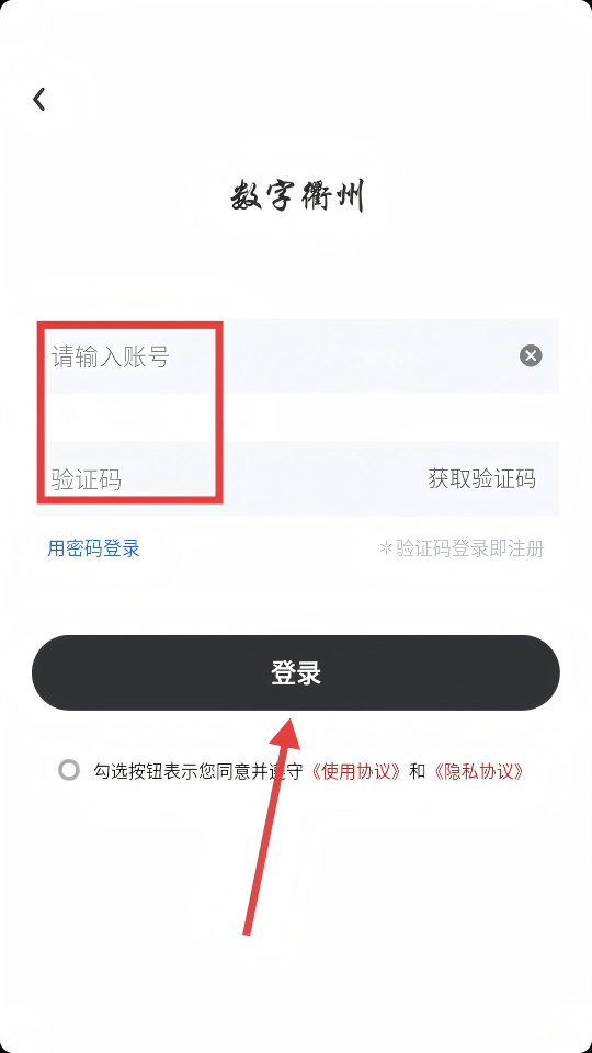 4、在驗證碼登錄頁,輸入賬號、獲取并填寫驗證碼,勾選同意協(xié)議后點擊【登錄】,完成登錄操作。