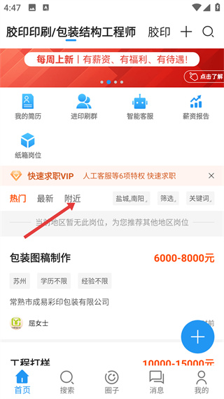 1、在APP首頁點(diǎn)擊【附近】標(biāo)簽,篩選附近崗位列表。