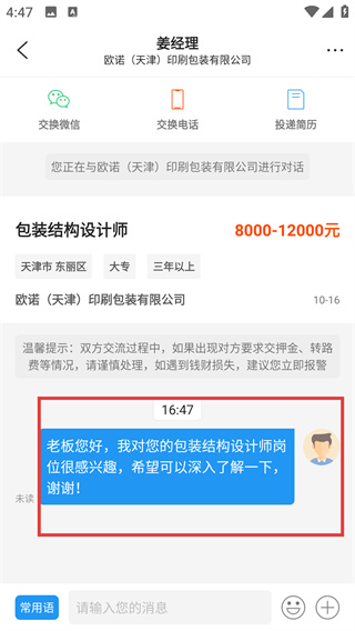 4、在聊天界面發(fā)送感興趣的溝通消息,完成崗位溝通流程。