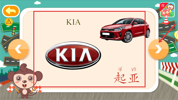 3、在車(chē)標(biāo)學(xué)習(xí)頁(yè)面,學(xué)習(xí)【起亞(KIA)】的車(chē)標(biāo)、車(chē)型及拼音,了解品牌知識(shí)。
