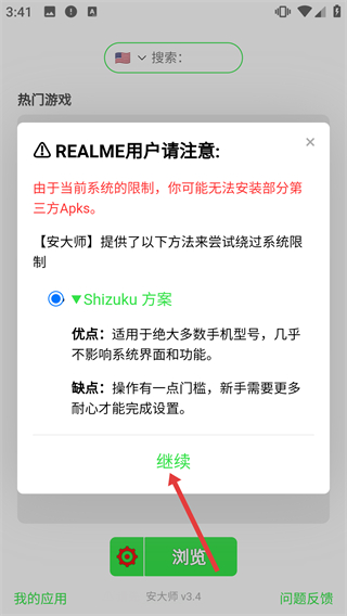 1、在REALME用戶提示彈窗中點(diǎn)擊【繼續(xù)】,該彈窗介紹了【Shizuku-方案】的優(yōu)缺點(diǎn),可繼續(xù)使用軟件。