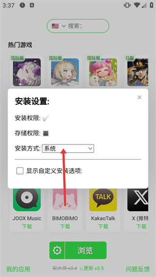 3、在安裝設(shè)置彈窗中,可查看安裝權(quán)限、存儲(chǔ)權(quán)限及安裝方式等選項(xiàng),進(jìn)行安裝相關(guān)設(shè)置。