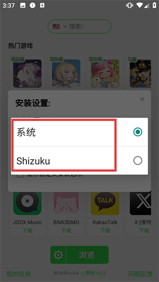 4、在安裝方式選擇中,可選擇【系統(tǒng)】或【Shizuku】,根據(jù)需求選擇后完成安裝方式設(shè)置。