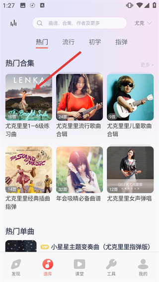 1、打開(kāi)尤克里里APP譜庫(kù)頁(yè)面,找到【尤克里里1-6級(jí)練習(xí)曲】合輯,點(diǎn)擊進(jìn)入合輯詳情頁(yè)。