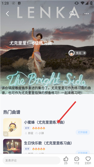 2、在合輯詳情頁(yè),點(diǎn)擊【小蜜蜂(尤克里里練習(xí)曲)】,進(jìn)入曲譜頁(yè)面。