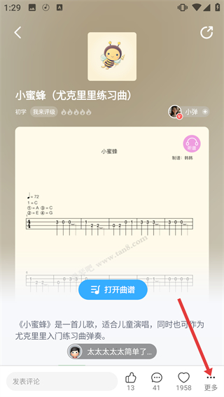 3、在曲譜頁(yè)面,點(diǎn)擊右下角【更多】,彈出更多操作選項(xiàng)。