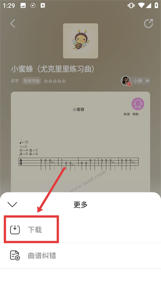 4、在更多選項(xiàng)中,點(diǎn)擊【下載】,完成曲譜下載操作。