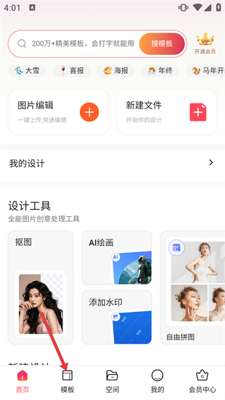1、在設(shè)計(jì)工具首頁,點(diǎn)擊底部功能欄的“模板”選項(xiàng),進(jìn)入模板選擇頁面,可瀏覽各類設(shè)計(jì)模板。