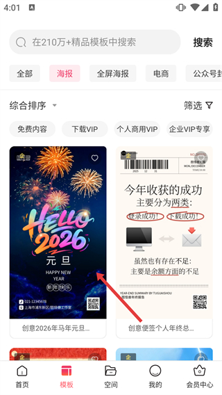 2、在模板頁面的海報(bào)分類下,選擇目標(biāo)模板(如“創(chuàng)意2026年馬年元旦”海報(bào)),進(jìn)入該模板的預(yù)覽與編輯頁面。