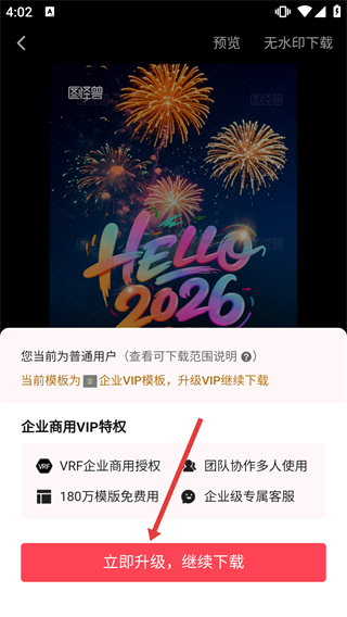 4、在彈出的權(quán)限提示頁面中,點(diǎn)擊“立即升級(jí),繼續(xù)下載”按鈕,完成VIP升級(jí)后即可獲取該模板的無水印版本。