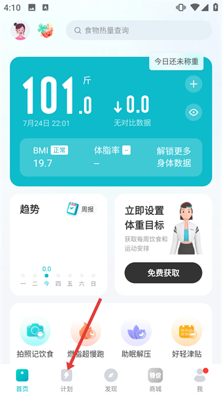 1、在首頁(yè),點(diǎn)擊底部導(dǎo)航欄的“計(jì)劃”選項(xiàng),進(jìn)入計(jì)劃任務(wù)頁(yè)面,該頁(yè)面提供體重管理相關(guān)的專(zhuān)屬計(jì)劃服務(wù)。