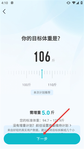 3、在目標(biāo)體重設(shè)置頁(yè)面,確認(rèn)或調(diào)整目標(biāo)體重后,點(diǎn)擊“下一步”按鈕,進(jìn)入專(zhuān)屬增重計(jì)劃的詳情頁(yè)面。