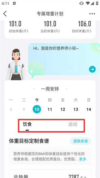 4、在專(zhuān)屬增重計(jì)劃頁(yè)面,可查看“飲食”“運(yùn)動(dòng)”板塊下的體重目標(biāo)定制內(nèi)容,獲取個(gè)性化的增重安排。