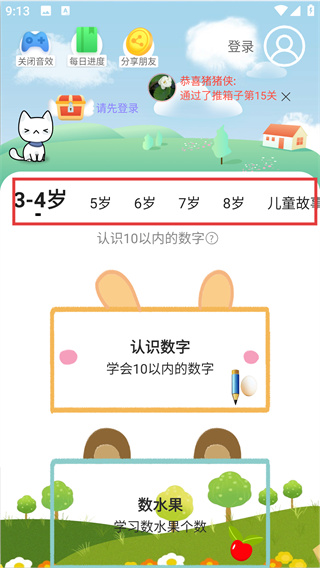 1、進(jìn)入應(yīng)用首頁(yè),選擇對(duì)應(yīng)年齡段分類,可查看【認(rèn)識(shí)數(shù)字】【數(shù)水果】等適配該年齡段的學(xué)習(xí)模塊,開啟啟蒙練習(xí)。