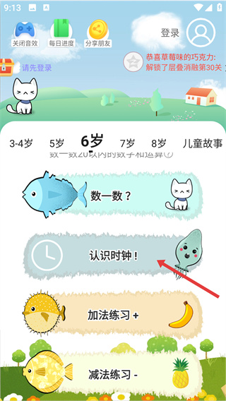2、在年齡段選擇欄切換至【6歲】分類,可看到【認(rèn)識(shí)時(shí)鐘】【加法練習(xí)】等進(jìn)階學(xué)習(xí)項(xiàng)目,選擇目標(biāo)項(xiàng)目進(jìn)入練習(xí)。