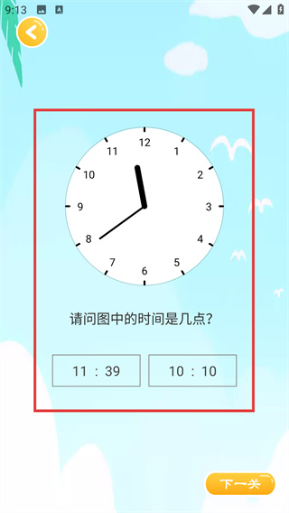 3、進(jìn)入【認(rèn)識(shí)時(shí)鐘】的練習(xí)頁(yè)面,觀察時(shí)鐘指針顯示的時(shí)間,在選項(xiàng)中選擇對(duì)應(yīng)的正確時(shí)間,完成該題的作答。