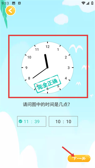 4、答題后顯示“完全正確”的反饋,點(diǎn)擊頁(yè)面底部的【下一關(guān)】按鈕,繼續(xù)進(jìn)行時(shí)鐘認(rèn)知的后續(xù)練習(xí)。