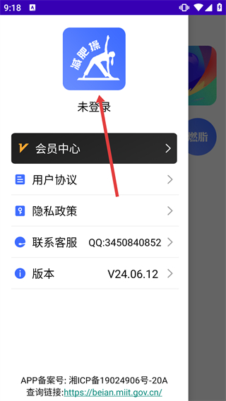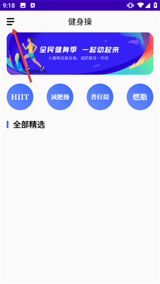 1、在健身操頁面,點擊左上角的菜單按鈕,展開側(cè)邊功能欄,該欄包含會員中心、用戶協(xié)議等功能及信息入口。