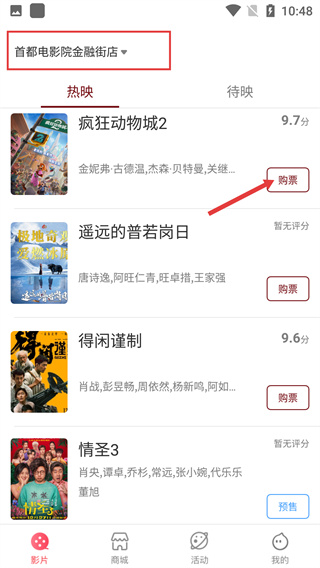 1、進(jìn)入界面后,可查看或選擇對應(yīng)的電影院的店,選定影片后點(diǎn)擊【購票】按鈕進(jìn)入場次選擇環(huán)節(jié)。