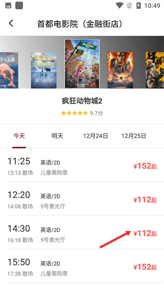 2、進(jìn)入影片場次頁面,選擇觀影日期,選定【14:30-英語2D】場次,其位于【5號激光廳】,票價為【112元起】。