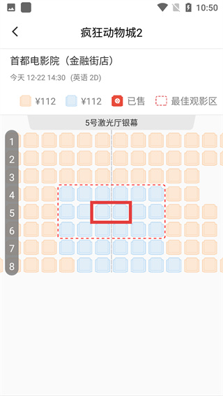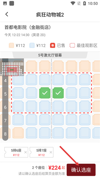 3、進(jìn)入選座界面后,可優(yōu)先選擇標(biāo)注【最佳觀影區(qū)】的區(qū)域,挑選座位確定觀影位置。