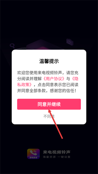 1、打開來電視頻鈴聲APP后,閱讀《用戶協(xié)議》《隱私政策》,點擊【同意并繼續(xù)】按鈕進入應(yīng)用。