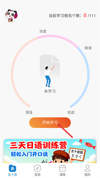 1、在五十音學習頁面,當前學習假名個數(shù)為0/111,點擊“開始學習”按鈕,可進入五十音圖列表的清音訓練界面。